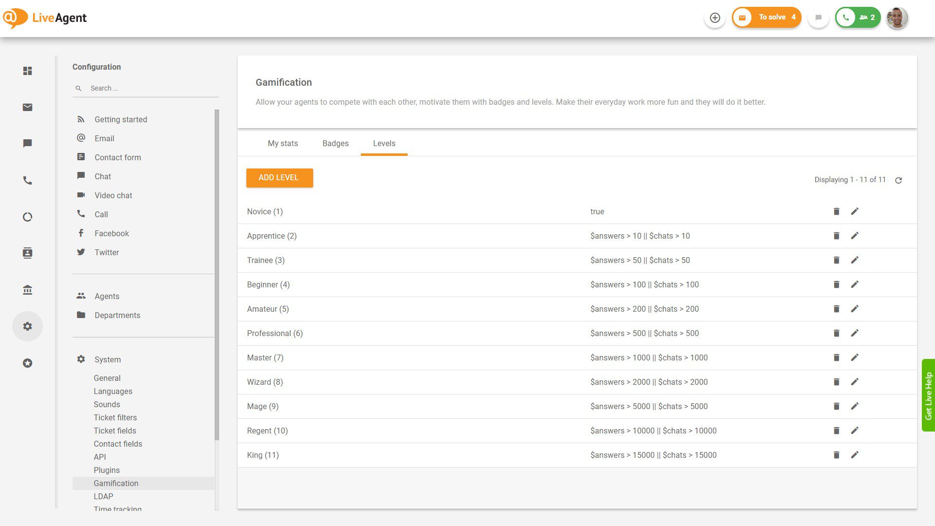 Currently, LiveAgent offers 12 pre-made levels. They’re fully customizable, so if you want to create your own personalized levels that match your company culture, you can do so.