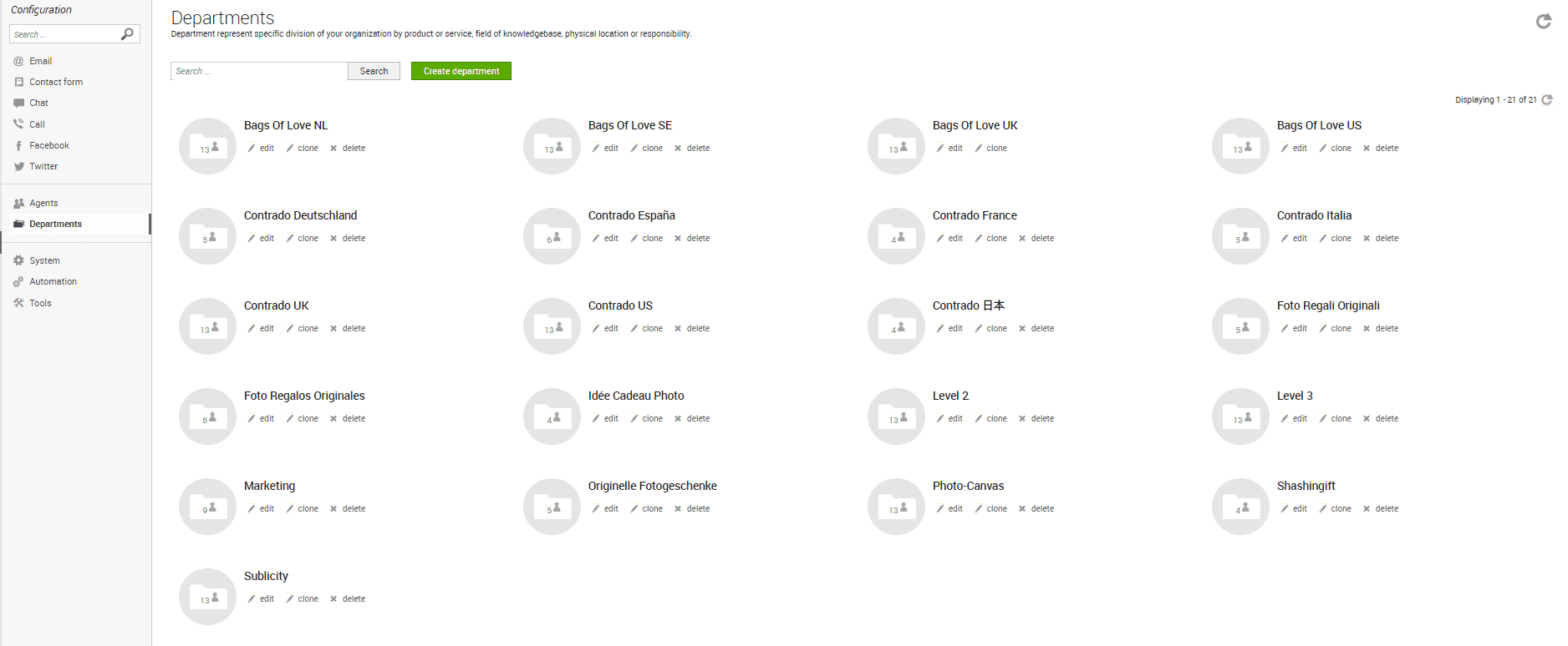 Contrado divided organization to departments according to their websites and languages: