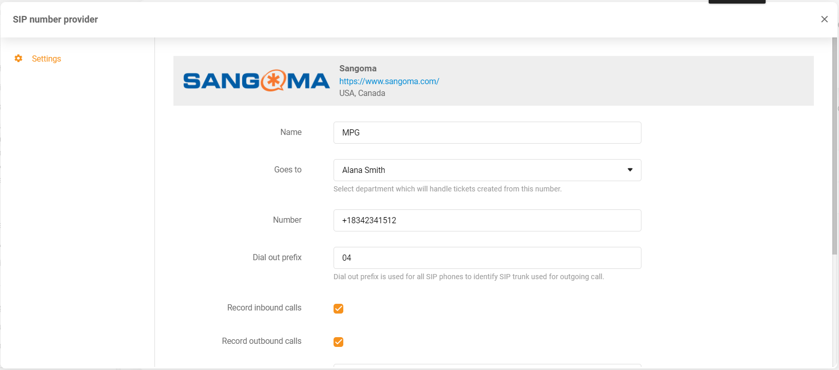 Simply navigate to Configurations > Call > Numbers > Sangoma. Add the VoIP number and use it right away.