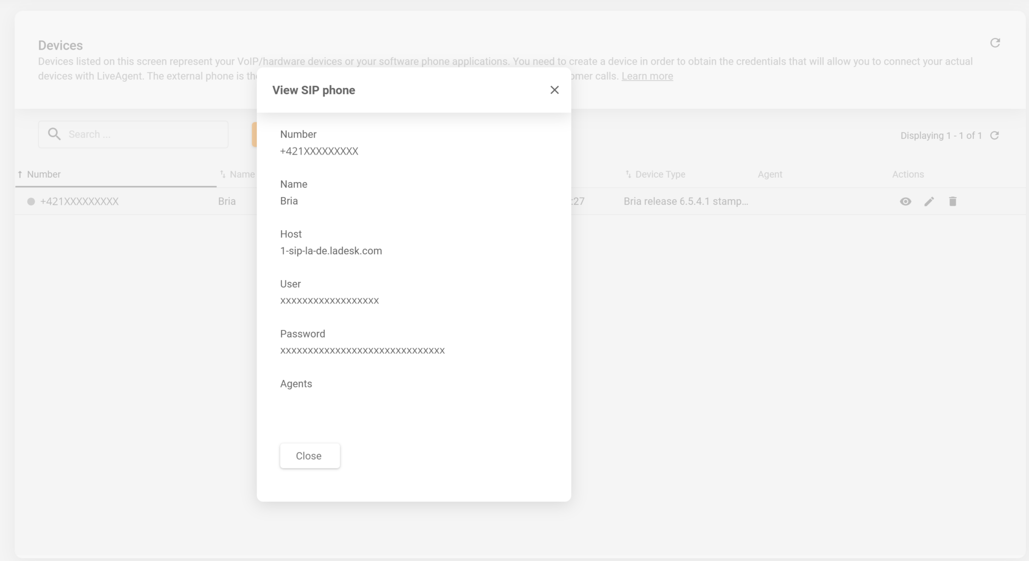 - Open your LiveAgent app and go to Configuration > Call > Devices. Click on the create button and select SIP. Now put in your VoIP provider number and name this device. When done, click on the View button (eye icon) and use the data you see in the voice configuration of Bria from the previous step.