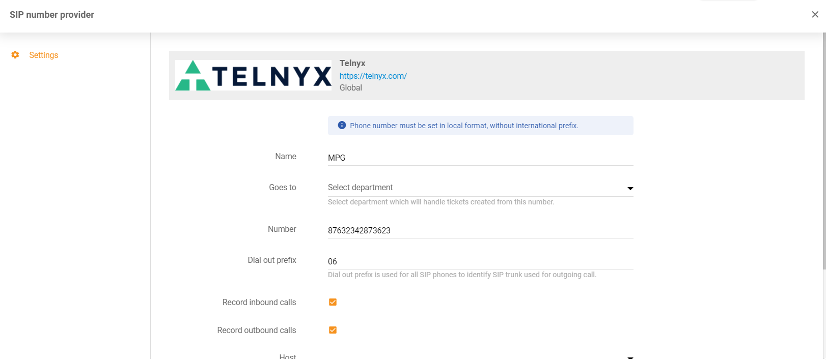 If you are interested in connecting Telnyx with the LiveAgent call center, simply login to your LiveAgent account and follow the instructions.