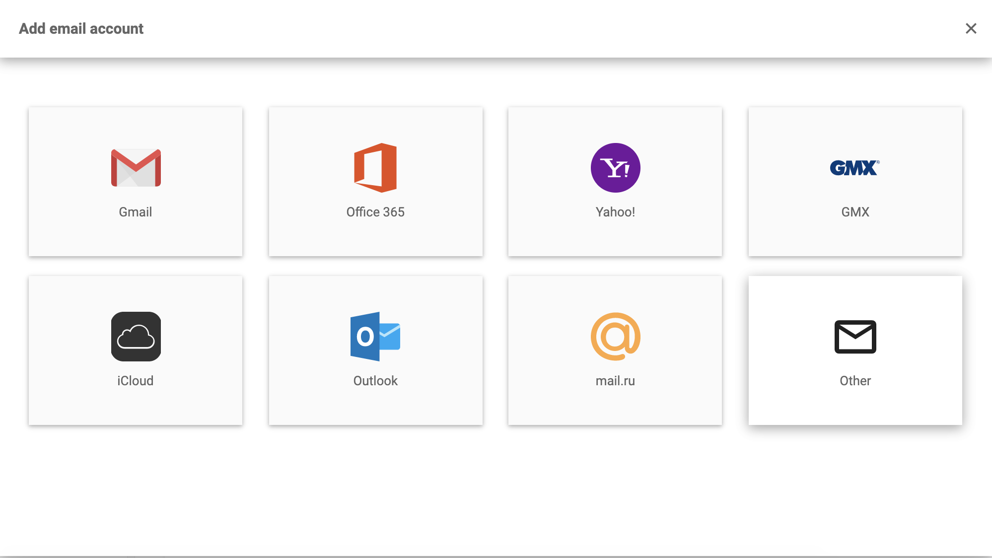 Go to LiveAgent > Settings > Email > Mail Accounts. Add a new email account and select Other. Select between Forwarding or IMAP/POP3. Provide your data and Save.