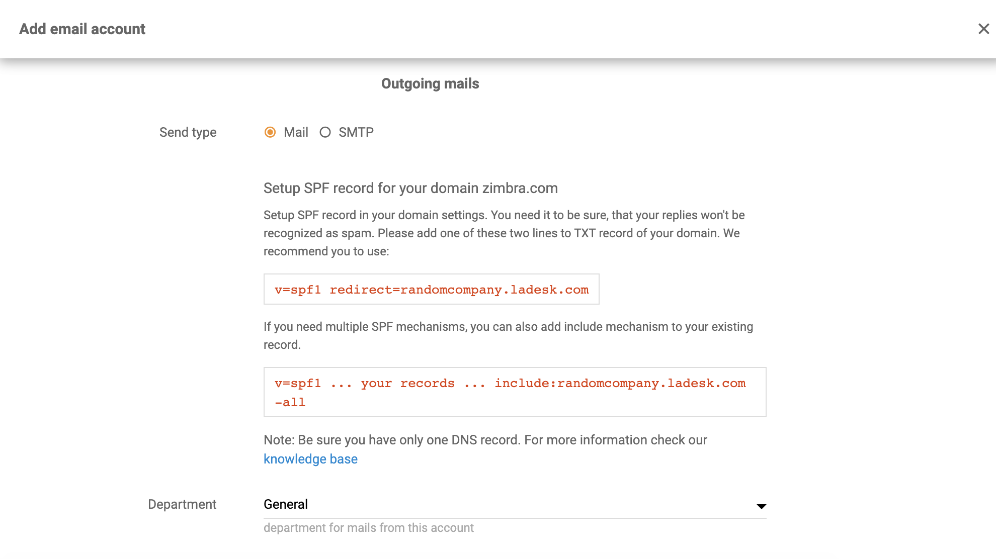 - Once you select Forwarding, enter your email address and Setup SPF record for your Zimbra domain. If you’re not sure how to do it, have a look at this guide from the Zimbra website. This has to be done to make sure your emails won’t be recognized as Spam by LiveAgent. When you’re done, select a department responsible for emails from this Zimbra account and click on Save.