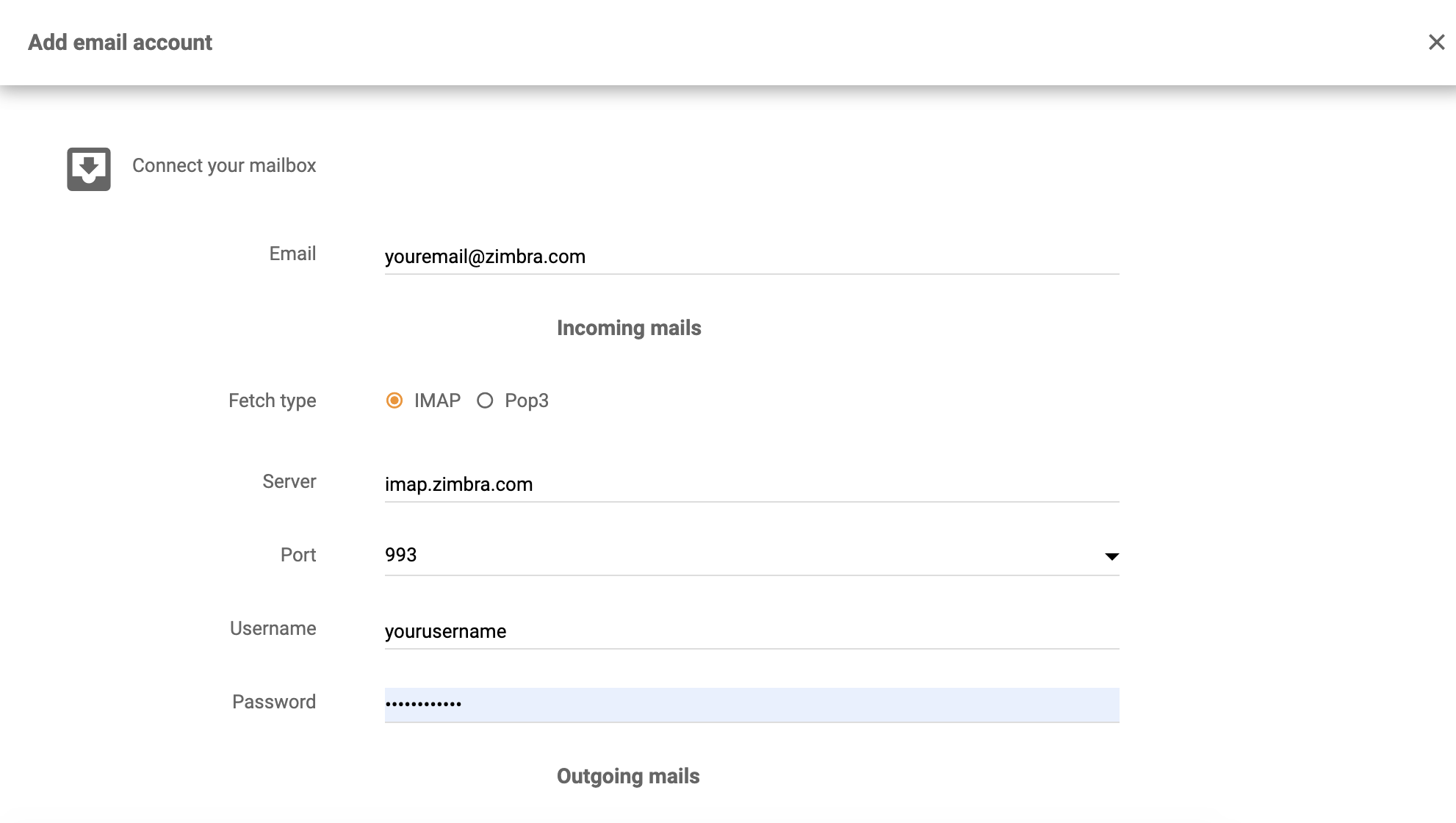 If you want to connect your Zimbra email via IMAP/POP3, select that option. Provide your email address, login info, and password. Select fetch type (IMAP or POP3), provide server info and port info. Then click on Save.