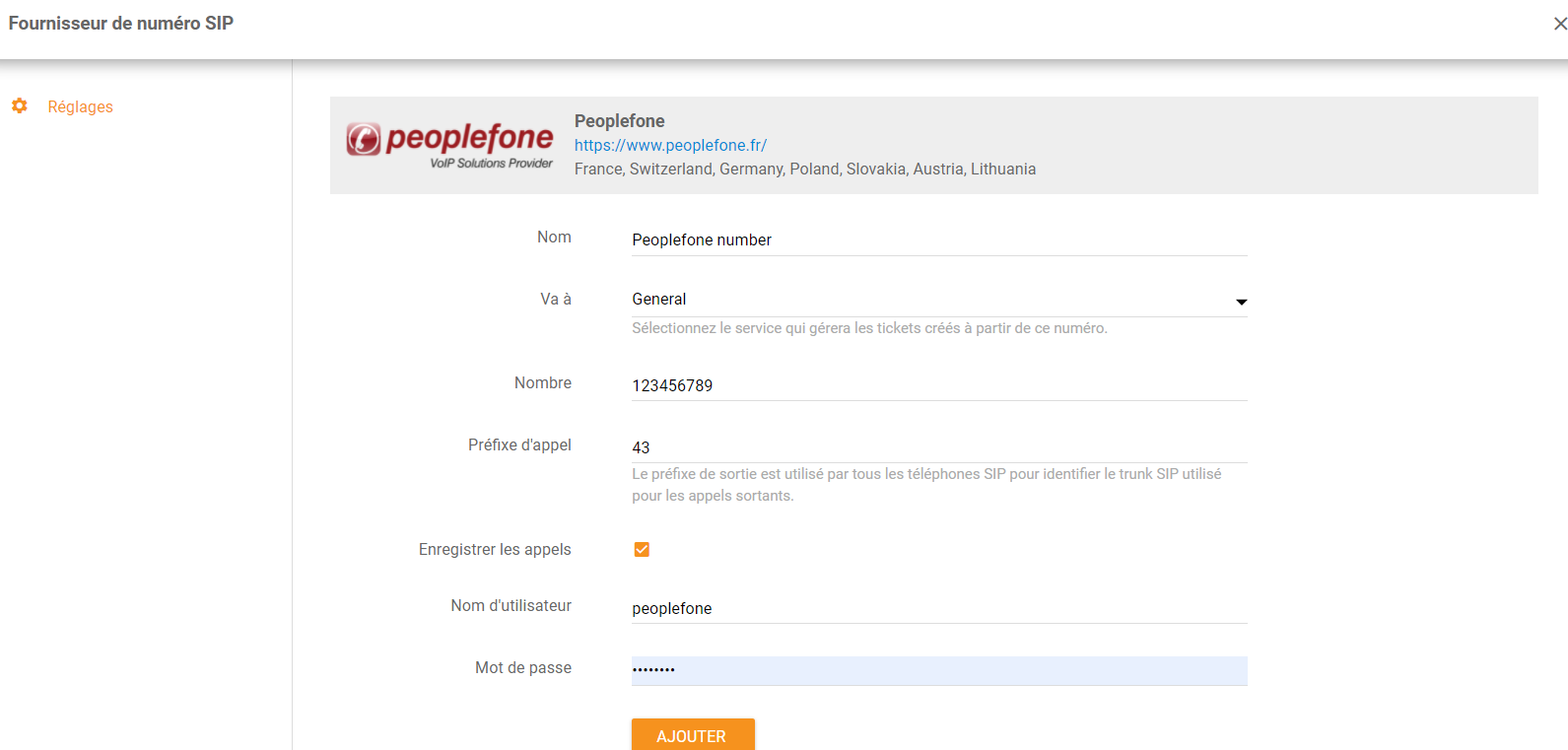All you have to do in LiveAgent is to go to Configuration > Call > Numbers and click on the Create button. Then select Peoplefone from the list of VoIP providers and connect your number.