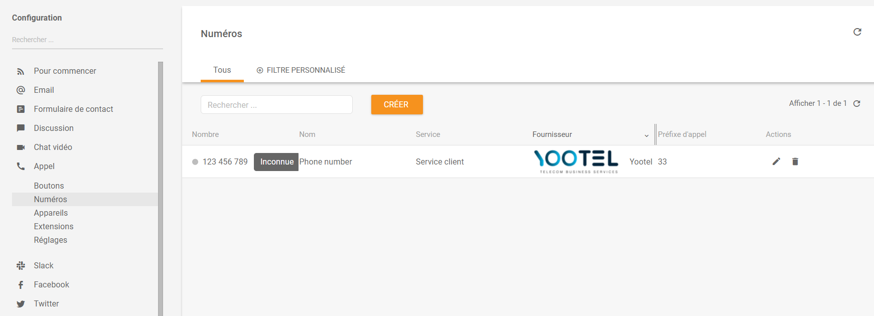 - Open LiveAgent and go to Configuration > Call > Numbers. Click on the orange Create button at the top.