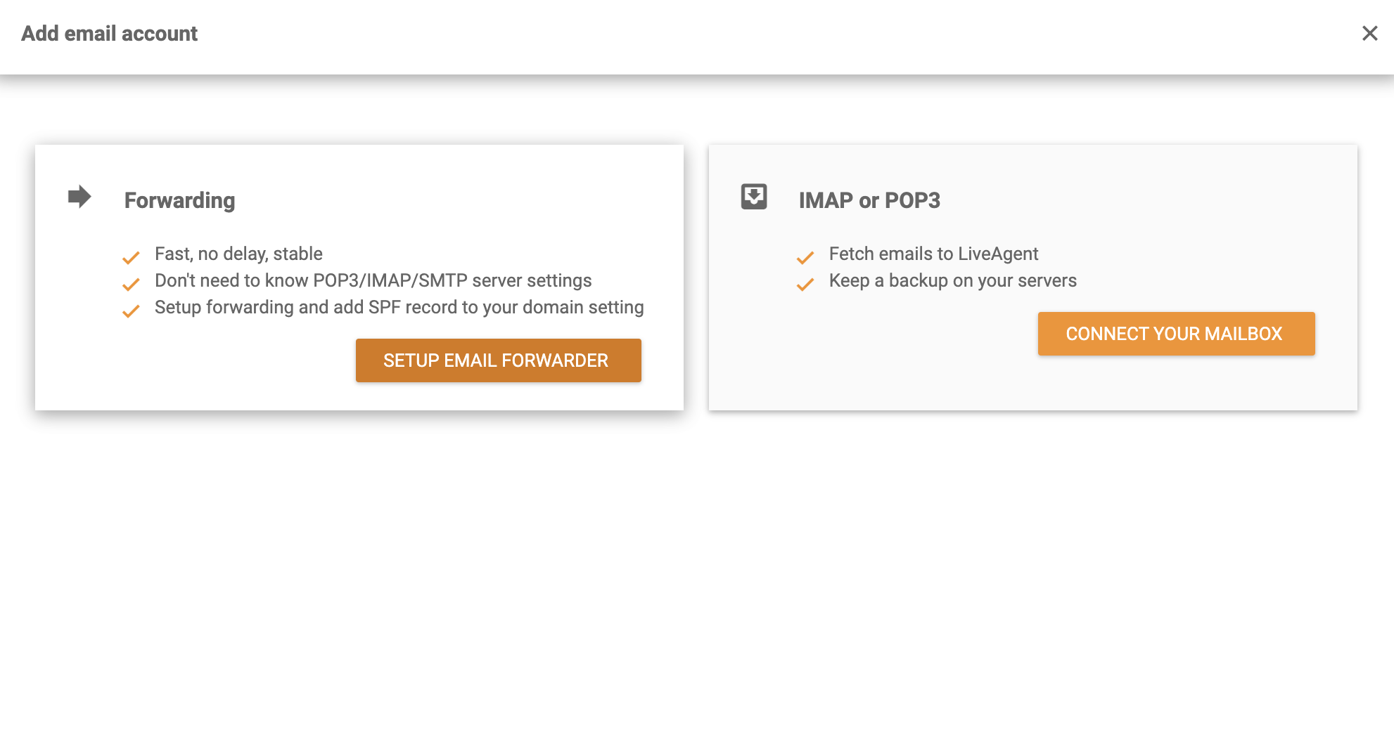 - Log in to LiveAgent and go to Configuration > Email > Mail Accounts. Click on the orange Add email account button at the top.