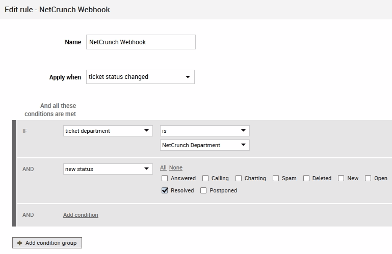 IF ticket department is (i.e.) NetCrunch Department AND new status is Resolved.