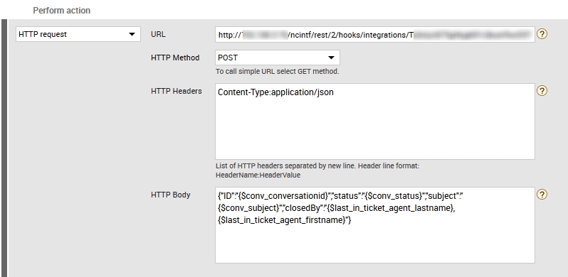 Now select the action “HTTP request” and add the URL with your replaced Web_Access_Address in the field for the URL. Select the HTTP Method “POST” and add the header “Content-Type:application/json”. Enter this to the HTTP Body to be sent as Data to NetCrunch: