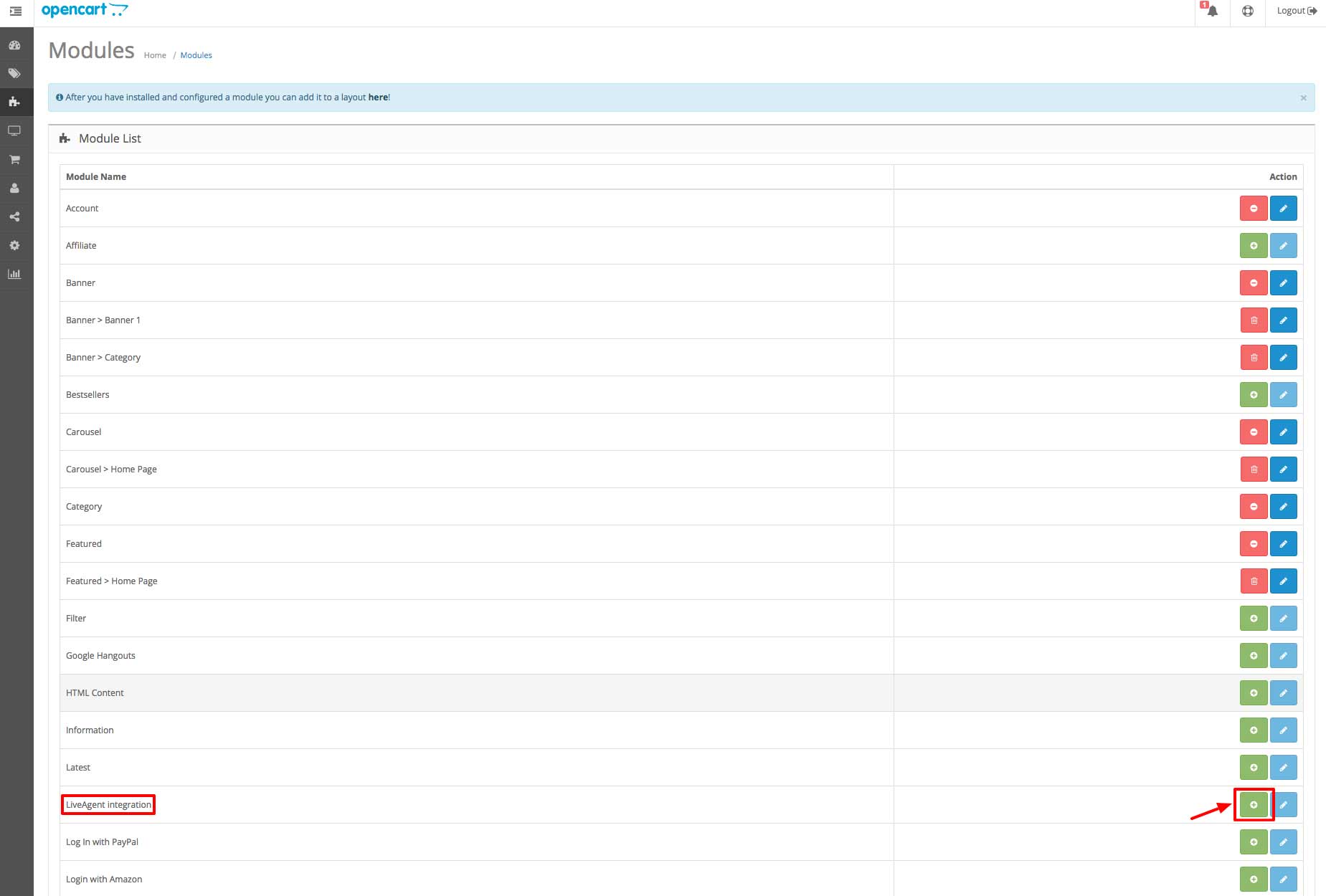 - Navigate to the Modules section in your Opencart admin panel and click on LiveAgent integration (green button).