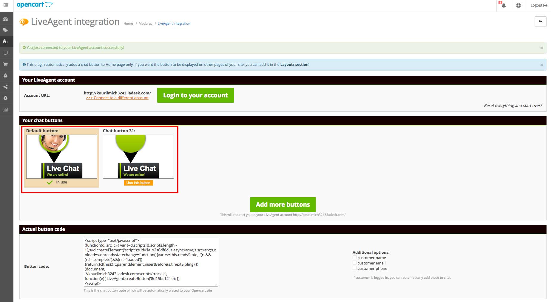 - You’re done. The default live chat button is shown on your website. If you want to change the default button, add new buttons in your LiveAgent account and then click on Use this button in the Opencart LiveAgent module.