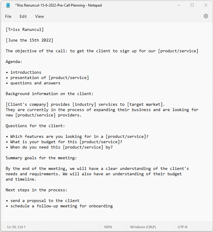 When you’re pre-call planning, it’s important to have a clear and concise note-taking system. One way to do this is by titling your notes with the date and time of the meeting, as well as the name of the client. This will help you to keep track of your meeting notes and get you prepared for each meeting.