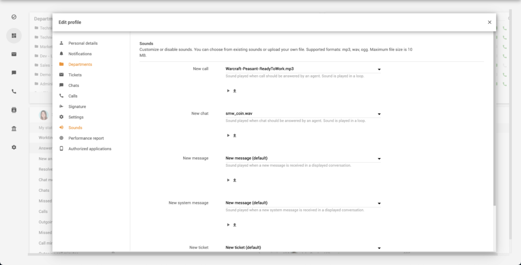 - Notification sounds for new calls, new chats, new messages, new system messages, and new tickets