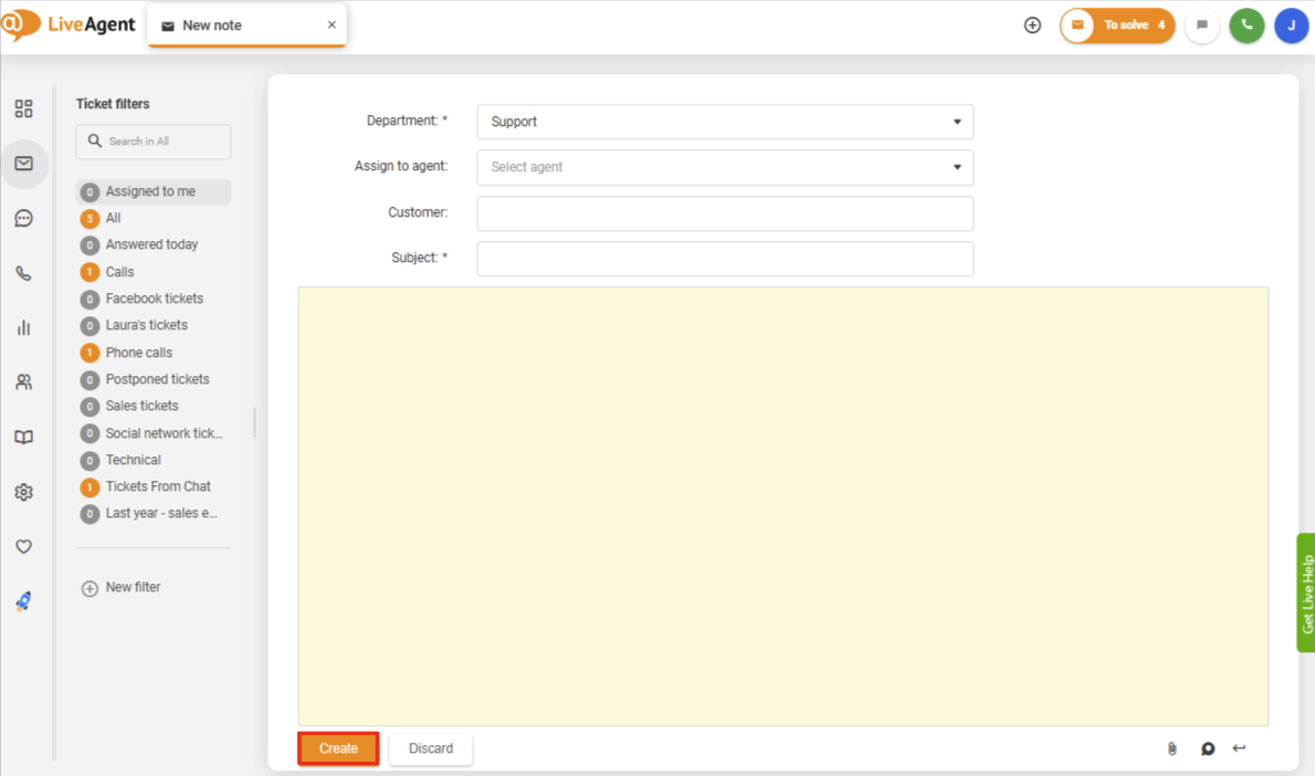 Additionally, an agent or admin can create a new ticket using an internal note to track an internal task that needs attention. This internal note would function like any other ticket but is used to manage internal processes rather than customer-facing issues.