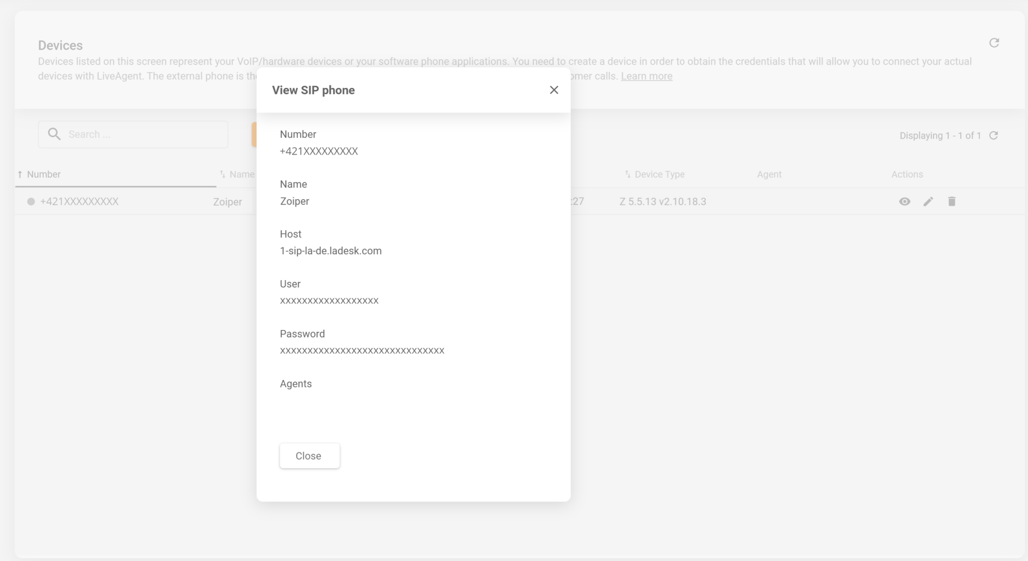 Once you have your VoIP number, you can simply Create a new device in LiveAgent that will use the number. Then with the details provided, you only have to put the details as a new account in Zoiper to finish the integration.