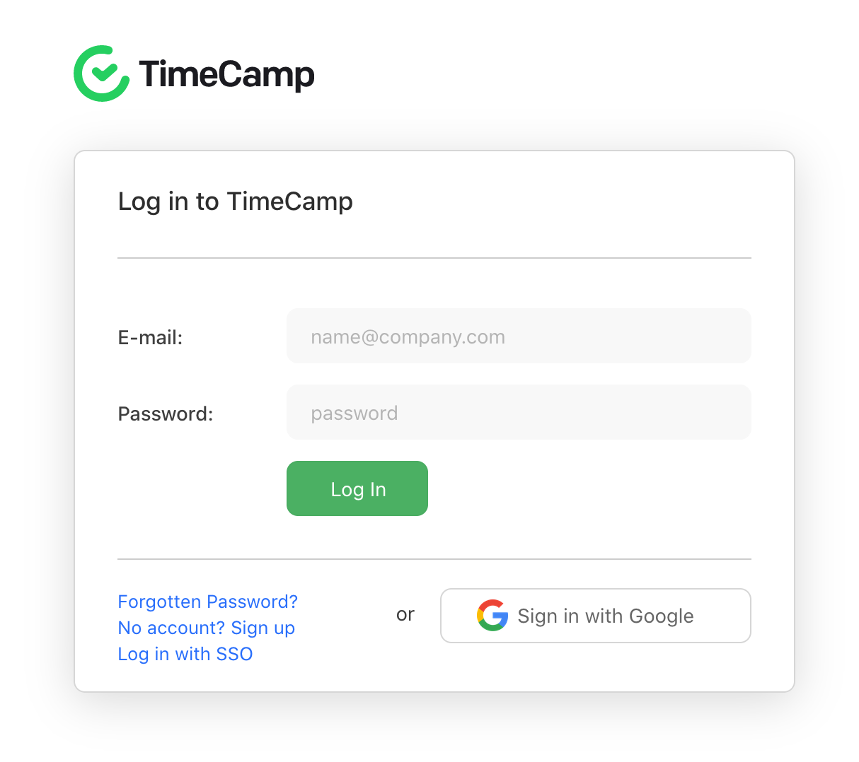 - Go to the TimeCamp website and create your free account or log in to your existing one. Account creation takes just a minute and you don’t have to input any credit card information to get started.